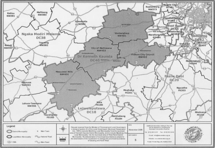 Keywords: Map No. 5 in Notice 1490 of 2008.png Notice 1490 of 2008 Depicts the modified boundaries of the Dr Kenneth Kaunda District Municipality File Notice 1490 of 2008 djvu Municipal Demarcation Board of South Africa 2008-11-28 PD-South-Africa-exempt Maps of North-West municipalities with 2006 borders Notice 1490 of 2008 05 |