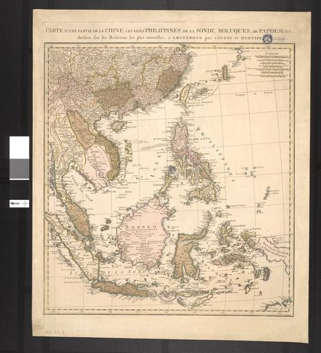 Keywords: Map of a Part of China, the Philippine Islands, the Isles of Sunda, the Moluccas, the Papuans WDL460.png Artwork ru Ка та части Китая Филиппинских ост овов ост овов Сунда олуккских ост овов Папуасских ост овов fr Carte d'une partie de la Chine des Philippines des îles Sunda des Moluques des Papous en Map of a Part of China the Philippine Islands the Isles of Sunda the Moluccas the Papuans zh 包括中国 菲律宾群岛 巽他群岛 摩鹿加群岛以及巴布亚部分 区 内的 图 pt Mapa de uma Parte da China as Ilhas Filipinas as Ilhas de Sunda as Molucas os Papuans ar خريطة لجزء من الصين، وجزر الفلبين، وجزر ساندا، والمولوكاس، وبابوا ru Эта ка та юго-восточной части Азии и некото ых егионов Китая составленная в XVIII веке была опубликована в Амсте даме фи мой Covens and Mortier Пите о тье 1661-1711 гг основал п оцветающую компанию кото ая специализи овалась на выпуске новых изданий атласов Алексиса Юбе а Жайо иколя де Фе а и д угих ф анцузских ка тог афов о тье также п иоб ел все ка ты голландского ка тог афа Ф еде ика де Вита и п ава на их пе еиздание После сме ти о тье дела фи мы пе ешли к его сыну Ко нелису 1699-1783 гг В 1721 году Ко нелис женился на сест е Иоханнеса Ковенса 1697-1774 гг В том же году Ко нелис о тье и его шу ин основали фи му Covens and Mortier Ка ты и атласы этой фи мы входили в число лучших ка тог афических изданий XVIII века азвание этой ка ты п иведено на ф анцузском языке но геог афические названия и п имечания были пе еведены на голландский язык <br>Индокитай fr Cette carte du 18ème siècle du Sud-Est asiatique et de certaines parties de la Chine a été publiée à Amsterdam par la société de Covens et Mortier Pieter Mortier 1661-1711 construisit une entreprise qui prospéra par la publication de nouvelles éditions d'atlas d'Alexis Hubert Jaillot Nicolas de Fer et d'autres cartographes français Mortier acquit également le stock du cartographe hollandais Frederik de Wit ainsi que le droit de reproduire ses cartes Lorsque Mortier décéda l'entreprise passa à son fils Cornelis 1699-1783 En 1721 Cornelis épousa la sœur de Johannes Covens 1697-1774 La même année Cornelis Mortier et son beau-frère fondèrent la société Covens et Mortier Leurs cartes et leurs atlas étaient les publications cartographiques les plus connues du siècle Le titre de cette carte est en français mais un grand nombre de noms de lieu et les notes ont été traduits en néerlandais <br>Indochine en This 18th-century map of southeast Asia and parts of China was published in Amsterdam by the firm of Covens and Mortier Pieter Mortier 1661-1711 built up a business that prospered by publishing new editions of atlases by Alexis Hubert Jaillot Nicolas de Fer and other French mapmakers Mortier also acquired the stock of the Dutch mapmaker Frederik de Wit and the right to reprint his maps When Mortier died the business passed to his son Cornelis 1699-1783 In 1721 Cornelis married the sister of Johannes Covens 1697-1774 In the same year Cornelis Mortier and his brother-in-law founded the firm of Covens and Mortier Their maps and atlases were among the best known cartographic publications of the century The title of this map is in French but many of the place names and notes have been translated into Dutch <br>Indochina zh 这幅 18 世纪的 南亚和中国部分 区的 图是由 Covens and Mortier 公司 阿姆斯特丹出版的 Pieter Mortier (1661-1711 年)成立了 家公司,这家公司 出版 Alexis Hubert Jaillot Nicolas de Fer 及其他法国制图师的新版 图集 蒸蒸日上 Mortier 还获得了荷兰制图师 Frederik de Wit 绘制的 图以及再次印刷这些 图的 利 Mortier 去世后,该公司交由他的儿子 Cornelis(1699-1783 年)经营 1721 年,Cornelis 与 Johannes Covens(1697-1774 年)的妹妹(或姐姐)结婚 同年,Cornelis Mortier 和其姐夫(或妹夫)共同创建了 Covens and Mortier 公司 这家公司 出版的 图和 图集位居该世纪 著名的 图出版物行列 这幅 图的标题采用的是法语,但是其中的很多 名和说明都已经被翻译成了荷兰语 <br>印度支那 pt Este mapa do século XVIII do Sudeste Asiático e de partes da China foi públicado em Amsterdam pela empresa de Covens e Mortier Pieter Mortier 1661-1711 construiu um negócio que prosperou com a publicação das novas edições dos atlas de Alexis Hubert Jaillot Nicolas de Fer e outros cartógrafos franceses Mortier adquiriu também o estoque do cartógrafo holandês Frederik de Wit e o direito de reimprimir seus mapas Com a morte de Mortier a empresa passou para seu filho Cornelis 1699-1783 Em 1721 Cornelis casou-se com a irmã de Johannes Covens 1697-1774 No mesmo ano Cornelis Mortier e seu cunhado fundaram a empresa de Covens e Mortier Seus mapas e atlas estavam entre as publicações cartográficas mais conhecidas do século O título deste mapa está em francês mas muitos dos topônimos e observações foram traduzidos para o holandês <br>Indochina ar نشرت هذه الخريطة من القرن الثامن عشر لجنوب شرق آسيا وأجزاء من الصين  شركة كوفنز ومورتيير في أمستردام أسس بيتر مورتيير 1661-1711 منشأة ازدهرت من 