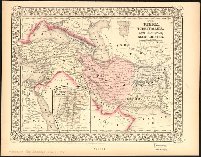 Keywords: Map of Persia, Turkey in Asia- Afghanistan, Beloochistan WDL11689.png Artwork ru итчелл С Огастeс Сэмюэл Огастeс 1792-1868 fr Mitchell S Samuel Augustus 1792-1868 en Mitchell S Augustus Samuel Augustus 1792-1868 zh 米切尔 塞缪尔 奥古斯塔斯 1792-1868 pt Mitchell S Augustus Samuel Augustus 1792-1868 ar ميتشيل، سامويل أوغستس 1792-1868 es Mitchell S Augustus Samuel Augustus 1792-1868 ru Ка та Пе сии Ту ции в Азии Афганистан Белуджистан fr Carte de la Perse et de la Turquie en Asie Afghanistan Baloutchistan en Map of Persia Turkey in Asia Afghanistan Beloochistan zh 亚洲波斯和 其 图:阿富汗 俾路支 pt Mapa da Pérsia e da Turquia na Ásia Afeganistão Baluquistão ar خريطة بلاد فارس وتركيا في آسيا أَفْغَانِسْتَان، بلوشستان ru Сэмюэл Огастeс итчелл 1792-1868 гг был известным аме иканским геог афом и ка тог афом Большая часть его абот посвящена США но он также составил ка ты д угих егионов ми а в том числе и данную ка ту Османской импе ии Пе сии сов еменный И ан Афганистана и Белуджистана дати ованную 1868 г Основные те ито иальные единицы изоб аженные итчеллом п инадлежат Ту ции то есть главной части Османской импе ии включающей те ито ии сов еменных Ту ции И ака Си ии и Ливана; Пе сии; Афганистану и Белуджистану в настоящее в емя большая часть этой те ито ии п инадлежит Пакистану В то в емя Египет и большая часть А авийского полуост ова по сути находились под господством Османской импе ии но обладали высокими у овнем автономии поэтому итчелл показывает их отдельными госуда ствами а в езной ка те в нижнем левом углу изоб ажена Палестина или Святая Земля кото ая очень инте есовала аме иканских читателей в XIX в Эта ка та также была опубликована в <em>« овом общем атласе итчелла»</em> 1869 г <br>А авийский залив; А авийский полуост ов; Пе сидский залив fr Samuel Augustus Mitchell 1792 1868 était un géographe et cartographe américain de renom La majorité de son travail porte sur les États-Unis mais il exécuta également des cartes d'autres parties du monde notamment cette carte de 1868 de l'Empire ottoman de la Perse aujourd'hui l'Iran de l'Afghanistan et du Baloutchistan Les principales unités territoriales que Mitchell présente sont la Turquie soit le cœur de l'Empire ottoman composé aujourd'hui de la Turquie de l'Irak de la Syrie et du Liban la Perse l'Afghanistan et le Baloutchistan aujourd'hui principalement le Pakistan cette époque l'Égypte et une grande partie de la péninsule arabique relevaient techniquement de la souveraineté de l'Empire ottoman mais restaient très autonomes et c'est pourquoi Mitchell les représente comme des États distincts Un cartouche dans la partie inférieure gauche illustre la Palestine ou Terre sainte une question qui suscite un grand intérêt aux yeux des lecteurs américains du XIX<sup>e</sup> siècle Cette carte fut également publiée dans <em>Nouvel atlas général de Mitchell</em> 1869 <br>Golfe Arabique; Péninsule arabique; Golfe Persique en Samuel Augustus Mitchell 1792 1868 was a renowned American geographer and cartographer The majority of his work focused on the United States but he also made maps of other parts of the world including this 1868 map of the Ottoman Empire Persia present-day Iran Afghanistan and Baluchistan The main territorial units that Mitchell shows are Turkey meaning the core of the Ottoman Empire comprised of present-day Turkey Iraq Syria and Lebanon; Persia; Afghanistan; and Baluchistan mainly present-day Pakistan Egypt and much of the Arabian Peninsula were at that time technically under the sovereignty of the Ottoman Empire but they were highly autonomous and Mitchell shows them as separate states An inset map at the lower left depicts Palestine or the Holy Land a subject of great interest to 19th-century American readers This map also was published in <em>Mitchell's New General Atlas</em> 1869 <br>Arabian Gulf; Arabian Peninsula; Persian Gulf zh 塞缪尔·奥古斯塔斯·米切尔(Samuel Augustus Mitchell,1792 1868 年)是美国著名 理学 和制图师 他的 品多数都 于美国,但也绘制世界其他 区的 图,其中就包括这幅绘于 1868 年的奥斯曼 国 波斯(今伊 ) 阿富汗和俾路支的 图 米切尔 图中展示的主要 理区域包括 其(即奥斯曼 国中心区域,包括今 其 伊拉克 叙利亚和黎巴嫩) 波斯 阿富汗 和俾路支(主要位于今巴基斯 境内) 严格意义上 讲,埃及和阿拉伯半岛大部 区 当时归奥斯曼 国管辖,但因其高度自治, 以米切尔将之 为独立国家划分出 左下方插页 图描绘了巴勒斯 ,或曰 ,19 世纪的美国读 对这里极为关注 这幅 图还曾收录入 1869 年出版的<em> 米切尔新 用 图集 </em> <br>阿拉伯湾; 阿拉伯半岛; 波斯湾 pt Samuel Augustus Mitchell 1792 1868 foi um célebre geógrafo e cartógrafo americano A maior parte do seu trabalho se concentrava nos Estados Unidos mas ele também criou mapas de outras partes do mundo incluindo este mapa de 1868 do Império Otomano da Pérsia atual Irã do Afeganistão