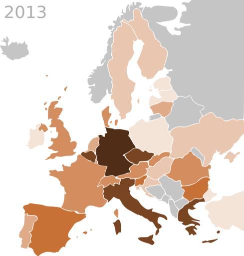 Keywords: MapEuropeSmall WattPerCapita 2013.svg EPIA figures Legend cumulated PV capacity in watts per inhabitant by country C5C5C5 1px solid 9E9E9E <0 1 n/a F4E3D7 1px solid E5B99A 0 1 “1 E9C6AF 1px solid D99C73 1 “10 DEAA87 1px solid CE7F4B 10 “50 D38D5F 1px solid B46631 50 “100 C87137 1px solid 8C4F26 100 “150 A05A2C 1px solid 64381B 150 “200 784421 1px solid 3C2310 200 “300 502D16 1px solid 140C05 300 “450 own SourceË http //www epia org/fileadmin/user_upload/Publications/EPIA_Global_Market_Outlook_for_Photovoltaics_2014-2018_-_Medium_Res pdf EPIA Global Market Outlook page 24 http //www webcitation org/6QGSvAF7w archive Released in June 2014 2014-06-15 20 36 48 Valid SVG margin 5px 0; inkscape Rfassbind This file is used as a frame in an animated GIF For further information seeË thumb center Europe WattPerCapita animated sequence 1992-2013 <center> <table cellspacing 1 cellpadding 3 style text-align right;background-color ccc; font-size 0 85em; width 425px; > <tr style text-align center; ><th colspan 5 style text-align center;background-color 333; color white; >Data table ” Watts Per Capita Calculation In 2013</th><tr> <tr style text-align center; > <th>Country</th> <th>Capacity<br />2013</th> <th>Added<br />2013</th> <th>Popultaion</th> <th>Watts per<br />Capita</th> </tr><tr style background-color white; > <td style text-align left; > Austria Austria </td><td> 613 </td><td> 250 </td><td>8 477 000</td><td>73 <small>3</small></td> </tr><tr style background-color f2f2f2; > <td style text-align left; > Belgium Belgium </td><td> 2 983 </td><td>215 </td><td>11 162 000</td><td>267 <small>2</small></td> </tr><tr style background-color white; > <td style text-align left; > Bulgaria Bulgaria </td><td> 1 020 </td><td> 10 </td><td>7 261 000</td><td>140 <small>5</small></td> </tr><tr style background-color f2f2f2; > <td style text-align left; > Croatia Croatia </td><td> 20 </td><td> 20 </td><td>4 253 000</td><td>4 <small>7</small></td> </tr><tr style background-color white; > <td style text-align left; > Cyprus Cyprus </td><td> 32 </td><td> 15 </td><td>1 141 000</td><td>28 <small>0</small></td> </tr><tr style background-color f2f2f2; > <td style text-align left; > Czech Republic Czech Republic </td><td> 2 175 </td><td> 88 </td><td>10 520 000</td><td>206 <small>7</small></td> </tr><tr style background-color white; > <td style text-align left; > Denmark Denmark </td><td> 548 </td><td> 216 </td><td>5 612 000</td><td>97 <small>6</small></td> </tr><tr style background-color f2f2f2; > <td style text-align left; > Estonia Estonia </td><td>1 </td><td>0 </td><td>1 283 000</td><td>0 <small>1</small></td> </tr><tr style background-color white; > <td style text-align left; > Finland Finland </td><td> 11 </td><td> 0 </td><td>5 436 000</td><td>2 <small>0</small></td> </tr><tr style background-color f2f2f2; > <td style text-align left; > France France </td><td> 4 673 </td><td> 613 </td><td>66 475 000</td><td>70 3<small></small></td> </tr><tr style background-color white; > <td style text-align left; > Germany Germany </td><td> 35 715 </td><td> 3 304 </td><td>80 586 000</td><td>443 <small>2</small></td> </tr><tr style background-color f2f2f2; > <td style text-align left; > Greece Greece </td><td> 2 579 </td><td> 1 043 </td><td>11 030 000</td><td>233 <small>8</small></td> </tr><tr style background-color white; > <td style text-align left; > Hungary Hungary </td><td> 22 </td><td> 10 </td><td>9 894 000</td><td>2 <small>2</small></td> </tr><tr style background-color f2f2f2; > <td style text-align left; > Ireland Ireland </td><td> 3 </td><td> 0 </td><td>4 595 400</td><td>0 <small>7</small></td> </tr><tr style background-color white; > <td style text-align left; > Italy Italy </td><td> 17 928 </td><td> 1 448 </td><td>59 862 000</td><td>299 5<small></small></td> </tr><tr style background-color f2f2f2; > <td style text-align left; > Latvia Latvia </td><td> 1 </td><td> 0 </td><td>2 011 000</td><td>0 <small>5</small></td> </tr><tr style background-color white; > <td style text-align left; > Lithuania Lithuania </td><td> 6 </td><td> 0 </td><td>2 956 000</td><td>2 <small>0</small></td> </tr><tr style background-color f2f2f2; > <td style text-align left; > Luxembourg Luxembourg </td><td> 30 </td><td> 0 </td><td>543 000</td><td>55 <small>2</small></td> </tr><tr style background-color white; > <td style text-align left; > Malta Malta </td><td> 23 </td><td> 7 </td><td>423 000</td><td>54 <small>4</small></td> </tr><tr style background-color f2f2f2; > <td style text-align left; > Netherlands Netherlands </td><td> 665 </td><td> 305 </td><td>16 800 000</td><td>39 <small>6</small></td> </tr><tr style background-color white; > <td style text-align left; > Poland Poland </td><td> 7 </td><td> 1 </td><td>38 548 000</td><td>0 <small>2</small></td> </tr><tr style background-color f2f2f2; > <td style text-align left; > Portugal Portugal </td><td> 278 </td><td> 36 </td><td>10 609 000</td><td>26 <small>2</small></td> </tr><tr style background-color white; > <td style text-align left; > Romania Romania </td><td> 1 151 </td><td> 1 100 </td><td>19 960 000</td><td>57 <small>7</small></td> </tr><tr style background-color f2f2f2; > <td style text-align left; > Slovakia Slovakia </td><td> 524 </td><td> 1 </td><td>5 413 000</td><td>96 <small>8</small></td> </tr><tr style background-color white; > <td style text-align left; > Slovenia Slovenia </td><td> 212 </td><td> 11 </td><td>2 060 000</td><td>102 <small>9</small></td> </tr><tr style background-color f2f2f2; > <td style text-align left; > Spain Spain </td><td> 5 340 </td><td> 118 </td><td>46 610 000</td><td>114 <small>6</small></td> </tr><tr style background-color white; > <td style text-align left; > Sweden Sweden </td><td> 40 </td><td> 18 </td><td>9 593 000</td><td>4 <small>2</small></td> </tr><tr style background-color f2f2f2; > <td style text-align left; > Switzerland Switzerland </td><td> 737 </td><td> 300 </td><td>8 075 000</td><td>91 <small>3</small></td> </tr><tr sty