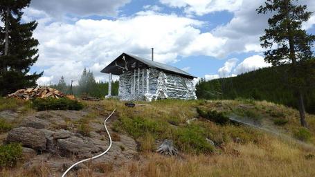| Keywords: yellowstone national park yellowstonenationalpark maple fire maplefire wildland fire wildlandfire outdoor serene To protect the Cougar Creek patrol cabin, it has been wrapped in aluminized structure wrap.The material is similar to the fire shields that firefighters carry with them, and it reflects up to 95 percent of radiant heat NPS Photo To protect the Cougar Creek patrol cabin, it has been wrapped in aluminized structure wrap.The material is similar to the fire shields that firefighters carry with them, and it reflects up to 95 percent of radiant heat NPS Photo |