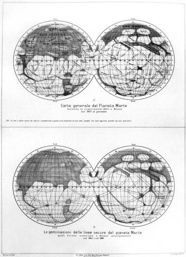 | Keywords: Maps of Mars by Schiaparelli 1877-1882-1888.jpg  Χάρτες του Άρη σχεδιασμένος α ό τον ιταλό αστρονόμο Τζιοβάννι Σκια αρέλλι με τα χαρακτηριστικά κανάλια  ου λανθασμένα  ιστευόταν ότι υ ήρχαν στον  λανήτη Πάνω γενικός χάρτης του Άρη 1877 Κάτω  αρουσιάζεται η εμφάνιση των καναλιών ανά δυο διδυμο οίηση α ό  αρατηρήσεις του 1882 και 1888 Giovanni Schiaparelli's maps of Mars Top General map of Mars 1877 Bottom showing the twinning of Martian canals by observations from 1882 and 1888 http //keespopinga blogspot com/2010/07/schiaparelli-e-la-vita-su-marte html http //4 bp blogspot com/_m0w1jebh02s/TE8zKqQInMI/AAAAAAAABu0/N3KybRsuVX0/s1600/schiaparelli_1877 jpg file 1888 Creator Giovanni Schiaparelli PD-old-100 <gallery> File Mars twin canals by Schiaparelli jpg Bottom picture solo </gallery> Maps of Mars by Giovanni Schiaparelli Martian canals |