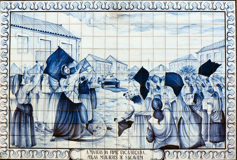 Keywords: Marcha da fome.jpg 2006-02-06 own assumed Juntas Azulejos in Sacavém 20th-century azulejos Blue and white azulejos Azulejos of people Azulejos of females Azulejos of buildings