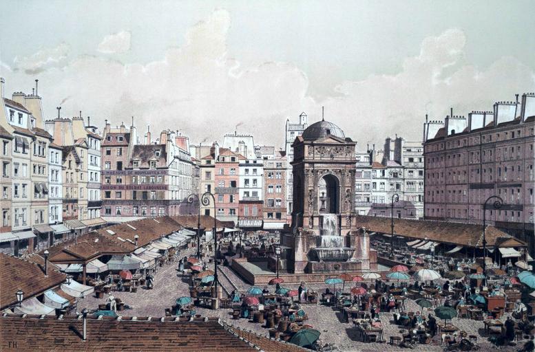 | Keywords: Marché des Innocents, 1855.jpg Artwork The Marché des Innocents was opened in 1788 in the place of what used to be Paris's largest cemetery the Cimetière des Innocents This market located in the first arrondissement served as a central location for Parisians to purchase various herbs and vegetables In addition to the hundreds of vendors the market also housed the occasional café and was at one time a place where homeless Parisians could go in the winter for a bowl of hot soup The Fontaine des Innocents originally erected in 1549 was transferred to the center of the market in the early 19th century Although highly decorative the fountain's four basins served as a sufficient source of water for the entire market The Marché des Innocents officially closed in 1858 to make way for the popular les Halles marketplace In 1865 the fontaine des Innocents was once again relocated to what is currently known as the Place des Innocents 1875-1882 lithograph 24 x 30 cm Institution Brown University Library object history exhibition history credit line Published in Theodor Josef Hubert Hoffbauer Paris à travers les âges Paris Firmin-Didot et cie 1885 accession number 1120658070700016 PD-old Lithographs of Paris Images of Paris from the Brown University Library Paris à travers les âges Marché des Innocents Historical images of Fontaine des Innocents 1855 in Paris |