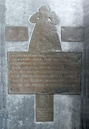 | Keywords: MargaretRolleBrass StGilesInTheWood.JPG Monumental brass in St Giles in the Wood Church Devon of Margaret Ford wife of John Rolle d 1570 of Stevenstone in the parish of St Giles in the Wood Inscribed Hic Stevenstonii Rolli jacet inclita mater nil habuit vera quae pietate prius cu quib vixit sex mascula pignor aliquit queis desideriv mortua triste tulit pars melior superos adiit cetusque pioru egidii templo hoc ossa sepulta cubant si quis plura velit vel noscere plura laborat vecimo hec prestat scripta tabella logo To the left is a brass plaque depicting her 2 daughters and to the left a plaque showing her 8 sons Below is a brass to her husband showing the arms of Rolle impaling Ford moved from elsewhere in the church own photo 2013 Lobsterthermidor <span class signature-talk >talk</span> 18 37 11 October 2013 UTC Rolle family Interior of St Giles in the Wood Church monuments in Devon Ledger stones in Devon Rolle arms Ford arms |