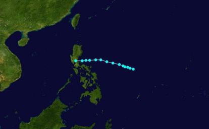 Keywords: Marge 1945 track.png Track map of Tropical Storm Marge of the 1945 Pacific typhoon season The points show the location of the storm at 6-hour intervals The colour represents the storm's maximum sustained wind speeds as classified in the Saffir-Simpson Hurricane Scale see below and the shape of the data points represent the nature of the storm according to the legend below User Nilfanion/Tc/T Created by Anhamirak using Wikipedia WikiProject Tropical cyclones/Tracks The background image is from NASA Tracking data is from the Joint Typhoon Warning Center 2009-12-13 Anhamirak 1945 Pacific typhoon season track maps |