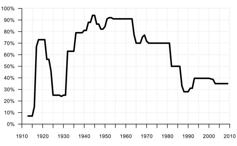 | Keywords: MarginalIncomeTax.svg en Plot of top bracket from U S Federal Marginal Income Tax Rates for 1913 to 2009 Data are from http //en wikipedia org/wiki/Income_tax_in_the_United_States History_of_progressivity_in_federal_income_tax own IGTaylor 2009-08-24 Created in R Code available on request cc-zero Personal income taxes in the United States Marginal tax rates |