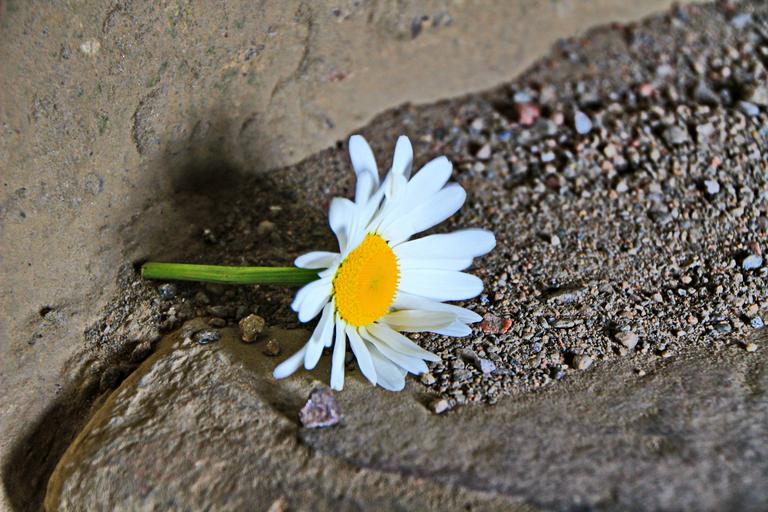 Keywords: marguerite flower sand leave lonely ground blossom bloom yellow white abandonment hope beauty in the hidden live