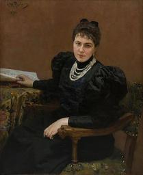 | Keywords: Maria Tenisheva by I.Repin (1896, Smolensk Art gallery).jpg Вот как описывает а ия Клавдиевна эпизод связанный с этим по т етом в биог афической книге Впечатления моей жизни « До сме ти надоело мне пози овать Репину Писал он и исовал меня чуть ли не шесть или семь аз мучил без конца а по т еты выходили один хуже д угого и каждый аз из-за них у меня бывали неп иятности с мужем он их п осто видеть не мог В особенности за один по т ет я очень ассе дилась Репин всегда боялся к асивых складок мягких тканей в женских по т етах Ему как истинному пе едвижнику подавай огожу иметь дело с ней ему было покойнее Затеял он как-то писать меня в че ном домашнем платье ше стяной юбке и шелковой кофточке и к этому более чем ск омному туалету он неп еменно захотел п илепить мне на шею пять ядов к упного жемчуга Как я ни отгова ивалась ни п отивилась он настоял на своем В уках у меня была тет адь омансов Чайковского Я была изоб ажена с ат ибутами певицы Подобная иллюст ация указывает каждому без ошибки к какому цеху п инадлежит заказчик по т ета о все бы это ничего по т ет выходил довольно удачный свежий по к аскам К асноватый лоскут ста инной мате ии на фоне хо ошо га мони овал с цветом лица платья и жемчуга и к счастью обложка омансов Чайковского была едва выписана и на ней не к асовалось имя издателя и ад ес о вот беда абота по т ета была как-то п е вана по случаю моего отъезда и в мое отсутствие Репин убоявшись ве оятно цветистого тона намазал вместо него п очную штукату ную стену ко ичневого коле а аве но у него с последним мазком свалился камень с души и он свободно вздохнул Потом по т ет был мне любезно п едоставлен взамен пяти тысяч ублей С мужем у меня опять из-за него вышла исто ия Он не на шутку ассе дился и за деньги и за неудовлетво ительную вещь - Боже мой да когда же эти художники тебя п оучат и так тебя намалюют что аз навсегда отобьют охоту к подобной пачкотне » http //galik-123 livejournal com/119348 html 1896 Repin 1890s portraits of Russia female Female portraits by Ilya Yefimovich Repin Females with pearl necklaces in art Smolensk art gallery 1896 portrait paintings Portraits of Maria Tenisheva Files uploaded by Shakko from various sources Portraits with musical scores PD-old |