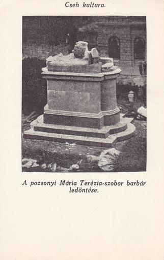 | Keywords: Maria Terezia szobor ledontes.jpg  Képeslap a pozsonyi Mária Terézia-szobor szétveréséről Postcard depicting the destruction of the Maria Theresa statue in Bratislava Translation of the text Czech culture - The barbaric toppling of the statue of Maria Theresa in Bratislava Pohľadnica o zničení bratislavskej sochy Márie Terézie Preklad textu Česká kultúra - Barbarské zvalenie bratislavskej sochy Márie Terézie 2011 03 23 upload date CoolKoon A kép Simon László gyűjteményéből származik Picture originates from László Simon's collection Obrázok pochádza zo zbierky Lászlóa Simona Ez a mű közkincs mert szerzői joga lejárt This image is in the public domain due to its age <gallery> Image Maria Terezia szobor ledontes hatlap jpg Reverse Image Maria Terezia szobor ledontes kep png Cropped and restored picture </gallery> PD-old-70-1923 History of Bratislava History of Hungary History of Austria Czechoslovak Republic 1918 1938 Statue of Maria Theresa in Bratislava 1921 in Slovakia Postcards of Hungary |