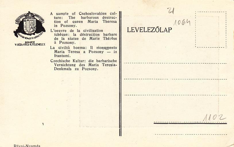 | Keywords: Maria Terezia szobor ledontes(hatlap).jpg  Röplap a pozsonyi Mária Terézia-szobor szétveréséről Fordítás a kép előlapján Flyer depicting the destruction of the Maria Theresa statue in Bratislava Leták o zničení bratislavskej sochy Márie Terézie Preklad textu Česká kultúra - Barbarské zvalenie bratislavskej sochy Márie Terézie 2011 03 23 upload date CoolKoon A kép Simon László gyűjteményéből származik Picture originates from László Simon's collection Obrázok pochádza zo zbierky Lászlóa Simona Ez a mű közkincs mert szerzői joga lejárt This image is in the public domain due to its age <gallery> Image Maria Terezia szobor ledontes jpg Obverse Image Maria Terezia szobor ledontes kep png Cropped and restored picture </gallery> PD-old-70-1923 History of Bratislava History of Hungary History of Austria History of Slovakia Czechoslovak Republic 1918 1938 Postcards of Hungary Statue of Maria Theresa in Bratislava |