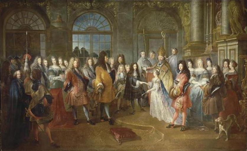 Keywords: Mariage de Louis de France, duc de Bourgogne.jpg Mariage de Louis de France duc de Bourgogne et de Marie-Adélaïde de Savoie célébré le 7 décembre 1697 par le cardinal de Coislin huile sur toile 1715 carton de tapisserie commandé par Louis XIV pour la manufacture royale des Gobelins en 1710 pour la tenture de l'histoire du roi RMNhttp //www photo rmn fr/LowRes2/TR1/6F2NR9/81-000193 jpg 1715 Antoine Dieu French c 1662-1727 PD-old-100 Oil paintings of people Tapestry cartoons Christian wedding in art Wedding ceremonies in France Former chapels of the Palace of Versailles Louis XIV of France in paintings Marie Adélaïde of Savoy Élisabeth Charlotte d'Orléans Louis Duke of Burgundy Louis Grand Dauphin Elisabeth Charlotte of the Palatinate Louise Françoise de Bourbon Paintings of Philip V of Spain Louise Bénédicte de Bourbon Marie Thérèse de Bourbon Children in art Arranged marriage Louis Alexandre Count of Toulouse Brides and grooms in art 1697 1715 paintings 1690s fashion Events in Versailles Antoine Dieu Pierre du Cambout de Coislin Royal wedding celebrations Philippe Duke of Orléans Regent of France Philip V of Spain while Duke of Anjou Françoise Marie de Bourbon 1697 weddings The marriage of the Duke of Burgundy to Marie Adelaïde of Savoy on December 7 1697 by Antoine Dieu |