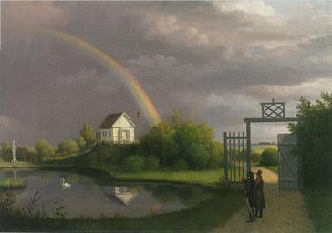| Keywords: Mariahvile i Sanderumgaard Have Eckersberg 1806.png Mariahvile i Sanderumgaard have 1806 - Hannover nr 19 - se længere nede Mariahvile in the garden at Sanderumgaard 1806 The romantic garden at Sanderumgaard - Hannover nr 19 - see below 1806 oil canvas cm 42 0 60 5 Sanderumgaard by Odense Denmark No 19 in Emil Hannover Maleren C W Eckersberg En Studie i dansk Kunsthistorie Kunstforeningen i København 1898 object history exhibition history credit line An Url http //museum odense dk/det-sker/det-sker/saerudstillinger/2010/sanderumgaards-romantiske-have/bog aspx exhibition was held 25-05-2010 - 26-09-2010 at Funen's Art Museum in relation to the reopening of the romantic garden at Sanderumgaard Odense Denmark after a restoration This painting is depicted in the Url http //museum odense dk/det-sker/det-sker/saerudstillinger/2010/sanderumgaards-romantiske-have/bog aspx exhibition book page 92 accession number Scanned from the exhibtion book page 92 Anne Christiansen Sanderumgaards Romantiske Have 2010 - Url http //museum odense dk/det-sker/det-sker/saerudstillinger/2010/sanderumgaards-romantiske-have/bog aspx About the exhibition book An expired work of art The drawing below is now considered a preliminary study by Eckersberg to this painting from 1806 Mariahvile i Sanderumgaard have - Cf Anne Christiansen in Sanderumgaards Romantiske Have 2010 pages 89 and 92 - Former attribution of the drawing was to Johan Frederik Clemens <br /> <gallery widths 220px heights 200px perrow 3 > Sanderumgaards have med regnbue KKSgb6659 png Sanderumgaards have med regnbue I forgrunden to mænd ved en låge </gallery> PD-old-100 Paintings by Christoffer Wilhelm Eckersberg Sanderumgård 1806 paintings |