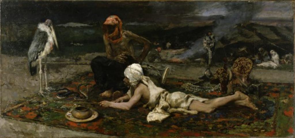 | Keywords: Mariano José MarÃa Bernardo Fortuny y Carbo - Hindu Snake Charmers - Walters 37117.jpg Mariano Fortuny accompanied General Prim's military expedition to Morocco in 1860 Following the defeat of the Moroccan army at the battle of Tétouan Spain controlled a portion of the western Sahara until 1976 On a number of occasions Fortuny returned to North Africa where the clarity of the atmosphere and the intensity of the sunlight profoundly influenced him In this scene set outdoors at twilight a turbaned Indian mesmerizes a cobra with a reed The artist a collector of Islamic decorative arts includes such accessories as a copper bowl luster plate and saddle 1869 Oil on canvas cm 58 74 124 46 2 22 ; Framed cm 98 74 164 47 14 61 accession number 37 117 17251 D H Foll Geneva date and mode of acquisition unknown A T Stewart date and mode of acquisition unknown A T Stewart Sale New York March 23-30 1887 no 128 William T Walters city Baltimore Henry Walters city Baltimore Walters Art Museum Henry Walters Acquired by William T Walters 1887 Signature Lower left Fortuny; Date Lower left R 1869 Fortuny and His Circle The Walters Art Gallery Baltimore 1970 L'Orientalisme de Delacroix a Kandinsky Musees royaux des Beaux-Arts de Belgique Brussels; Kunsthalle der Hypo-Kulturstiftung Munich; Musée des Beaux-Arts Marseille Marseille 2010-2011 place of origin New York City New York USA Walters Art Museum license 2D Paintings by Marià Fortuny Snake charmers Paintings in the Walters Art Museum |