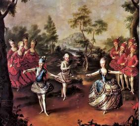 Keywords: Marie Antoinette Young6.jpg Artwork creator Johann Georg Weigert Fête Organized to Celebrate the Marriage of the Emperor Joseph II to Princess Marie-Josèphe of Bavaria 23/24 January 1765 1765 oil canvas cm 183 145 en Hofburg or Schönbrunn palace en One of three versions of this subject attributed for many years to Weikert who became one the most favored Austrian Court painters in the reign of the Empress Maria Theresa Weikert enjoyed a successful career in painting numerous portraits of the Empress and the ten of her sixteen children to survive to adulthood The attribution of the Schönbrunn painting and the other versions is no longer securely given to this artist however but to an unknown painter working at the Court of Maria Theresia It is the subject however which is of special interest The occasion was a performance written for and performed by the Imperial children to celebrate their eldest brother Joseph ™s marriage to Princess Marie-Josèphe of Bavaria on 23 January 1765 The role of cupid was played by the Archduke Maximilian while the Archduke Ferdinand portrayed the Groom and the Archduchess Marie-Antoinette the Bride The young ladies from left to right were Countesses Christine and Thérèse von Clary und Aldringen and Countesses Christine and Pauline von Auersperg The male roles were played by Frederick Landgraf von Furstenberg Count Franz Xavier von Auersperg and Counts Joseph and Wenceslas von Clary und Aldringen The first version of the painting remains in Vienna in the Schönbrunn Palace; a second version was commissioned from the artist in 1778 by Marie-Antoinette to hang in her dining-room in the Grand Trianon and is now in the Versailles Museum ; this third version commissioned by another of the participants was until recently in an American collection it Il dipinto raffigura i figli minori dell'imperatrice Maria Teresa Ferdinando Carlo e Massimiliano Francesco danzano un balletto con la sorella Maria Antonietta Il titolo della danza era Il Trionfo d'Amore musica da Florian Leopold Gassmann su libretto di Metastasio Lo spettacolo fu recitato a Schonbrunn nel gennaio del 1765 in occasione delle nozze dell'imperatore Giuseppe II con Maria di Baviera Questo dipinto è stato attribuito a Weikert 1745-1799 e una copia è conservata a Versailles http //www ladyreading net/marieantoinette/big/marie17 jpg Other versions <gallery> File Johann Georg Weikert 004 jpg Versailles File Marie Antoinette Dancing jpg Hofburg Vienna File Johann Georg_Weikert 005 jpg detail </gallery> PD-old-100 DEFAULTSORT Weikert Habsburg-Lorraine 1765 Johann Georg Weikert Paintings in the Hofburg Archduke Ferdinand of Austria-Este Archduke Maximilian Franz of Austria Marie Antoinette of Austria as a child House of Habsburg-Lorraine Triumph of Love Palace Theatre Schönbrunn Pietro Metastasio 18th-century oil portraits of children 18th-century portrait paintings in Austria 18th-century portraits of children at full length 18th-century dancers 1760s portrait paintings 1765 in theatre 1765 portrait paintings 1765 in dance