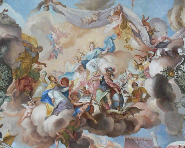 Keywords: Marienmünster Dießen Langhausfresko detail 3.jpg Marienmünster Dießen ehem Augustiner-Chorherren-Kirche Mariä Himmelfahrt heute Pfarrkirche Dießen am Ammersee <br /><br /> Fresko über dem Chor bzw Altarraum von Johann Georg Bergmüller 1736 Maria als Himmelskönigin verehrt von den Schutzpatronen der Dießener Klöster Hl Augustinus von Hippo Hl Georg Hl Stephanus Hl Martin von Tours Hl Petrus und Hl Paulus Creator Johann Georg Bergmüller own 2008-04 Photo Andreas Praefcke Own work all rights released Public domain Vaults of Marienmünster Dießen Frescos of Marienmünster Dießen