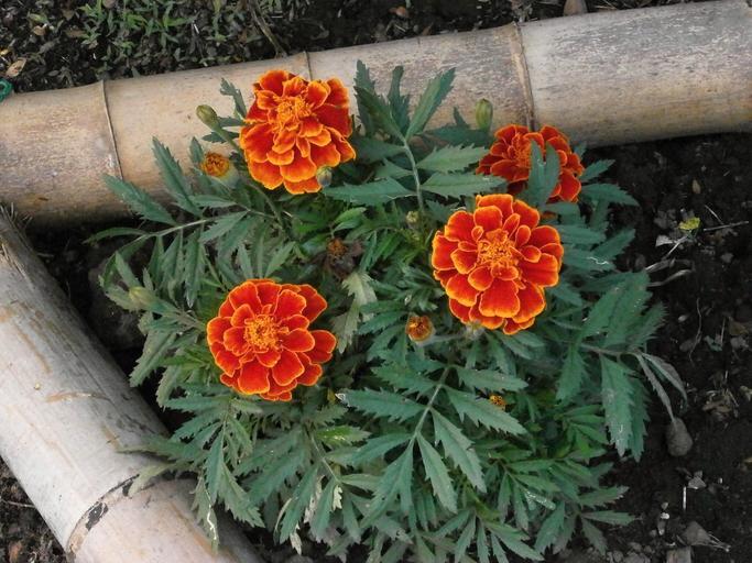 Keywords: marigold red flowers orange blossom summer flowers flower bed