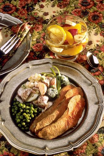 | Keywords: Marinated beef steak with potato vegetable salad.jpg A plate of sliced marinated beef steak with potato vegetable salad and peas There is a small bowl of mixed fruit behind the plate This was a poster in the Healthy Eating Tips series Topics/Categories Food and Drink Type Color Photo Source National Cancer Institute Len Rizzi Photographer 2552 1991-02 Reuse Restrictions None - This image is in the public domain and can be freely reused Please credit the source and/or author listed above Len Rizzi Photographer PD-USGov-HHS-NIH Media from National Cancer Institute Visuals Online Images uploaded by Fæ Beef steaks |