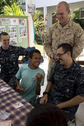 | Keywords: Marines and sailors do more with less in Timor-Leste 130828-N-ZZ999-052.jpg en Sgt Eric D Colley a 25-year-old field wireman with Echo Battery Battalion Landing Team 2nd Battalion 4th Marines 31st Marine Expeditionary Unit and a native of Middleton Idaho and sailors with the USS Denver laugh over a game of bingo with a member of the Ahisaun Foundation for disabled persons during a visit Aug 28 The visit was one of two events the Marines and sailors of the 31st MEU and crew of the USS Denver were able to volunteer for The other was a visit to the Bidau Akadiru-hun elementary school Both events were during Exercise Koolendong 13 where a battalion-sized force of the 31st MEU trained alongside Marine Rotational Force - Darwin and soldiers of the 5th Royal Australian Regiment during a weeklong live-fire exercise The 31st MEU is the Marine Corps' force in readiness for the Asia-Pacific region and is the only continuously forward-deployed MEU 2013-08-28 LPD 9 https //www dvidshub net/image/1018391 130828-N-ZZ999-052 2013-09-14 15 32 DILI TL PD-USGov-Military-Navy 31st Marine Expeditionary Unit Images from DoD uploaded by Fæ |