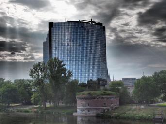 Keywords: maritime hotel ulm glass skyscraper architecture hotel maritime facade window hdr building danube sunbeam sky clouds dramatic mood