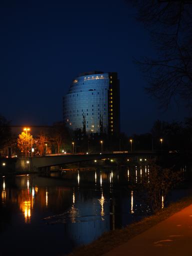 Keywords: maritime hotel ulm home mirroring facade building architecture at night river danube reflection