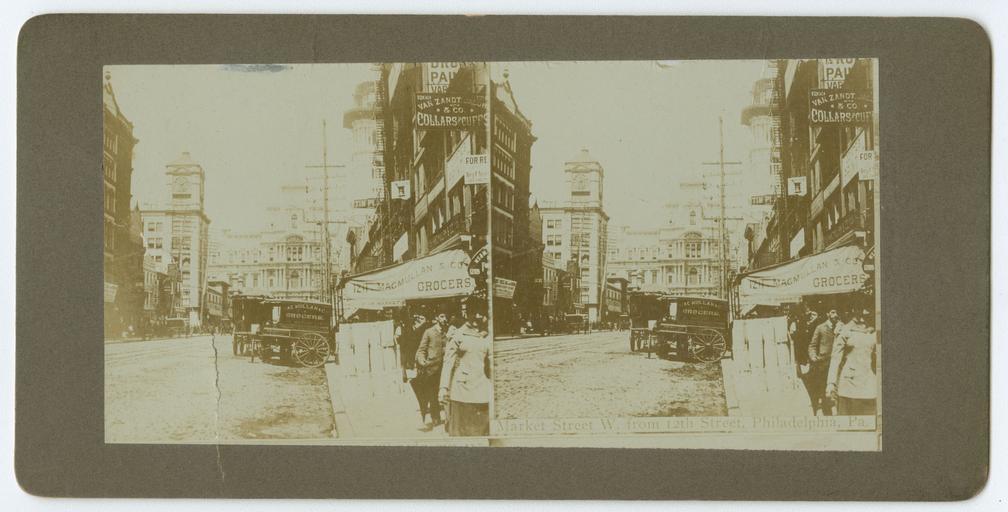 Keywords: stereographs philadelphia streets market street marketstreet wanamaker's grand depot wanamakersgranddepot theophilus p. chandler theophiluspchandler clothing stores clothingstores grocers city hall cityhall View showing the 1200-1300 block of Market Street in Philadelphia including Vanzandt, Jacobs & Co, collars and cuffs (1209 Market), MacMullan & Co., grocers (1211 Market), and Wanamaker's Grand Depot, designed by Theophilus P. Chandler, opened in 1876 in the former Pennsylvania Railroad sheds, and demolished 1902 (1300-1326 Market). Two wagons, marked "MacMullan & Co. Grocers" are visible on the street. Also shows City Hall. Accession number: P.2013.31 View showing the 1200-1300 block of Market Street in Philadelphia including Vanzandt, Jacobs & Co, collars and cuffs (1209 Market), MacMullan & Co., grocers (1211 Market), and Wanamaker's Grand Depot, designed by Theophilus P. Chandler, opened in 1876 in the former Pennsylvania Railroad sheds, and demolished 1902 (1300-1326 Market). Two wagons, marked "MacMullan & Co. Grocers" are visible on the street. Also shows City Hall. Accession number: P.2013.31 |