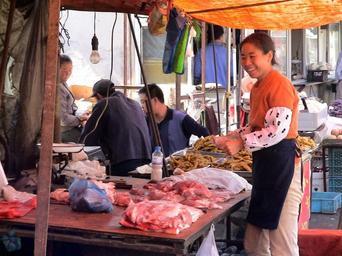 Keywords: market woman woman china sale meat dandong live normal live rural population happy satisfied laugh cheerful look forward market day
