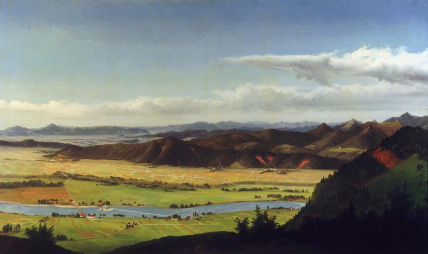 Keywords: marko pernhart painting oil on canvas artistic nature outside sky clouds landscape country countryside mountains forest trees river water village summer spring