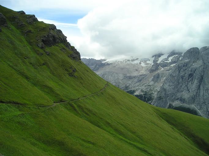 Keywords: marmolada north wall bindelweg singletrail clouds cloudiness dolomites mountains alpine south tyrol italy