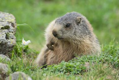 Keywords: Marmota marmota sp. 04.jpg Alpine Marmot Marmota marmota scratching its belly at the burrow entrance The white flower to the left is a specimen of Helleborus niger subsp niger own Bernie 2010-06-14 100 px 100 px 100 px 100 px 46 58 51 36 N 12 8 48 16 E region AT Marmota marmota Helleborus niger QualityImage