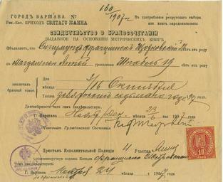 Keywords: Marriage certificate-1907.jpg Marriage certificate 1907 Original document in Russian language dated using both Old Style and New Style dates in Warsaw then part of Russian Empire Certificate dated November/December 23/6 1907; the marriage dated October 3/16 1907 Świadectwo ślubu z 1907 Oryginalny dokument w języku rosyjskim datowany przy użyciu obu dat nowego i starego porządku w Warszawie była częścią Imperium Rosyjskiego Świadectwo z 23 6 listopada grudnia 1907 data małżeństwa 3 16 października 1907 Свидетельство о б акосочетании 1907 Выдано в Ва шаве относившейся тогда к Российской Импе ии на усском языке и дати овано как по ста ому так и по новому стилю б акосочетание 3 16 октяб я 1907 выдача свидетельства 23 нояб я 6 декаб я 1907 Le certificat de mariage 1907 Le premier document utilisant en Russe le vieux style et les nouvelles style de dates à Varsovie il faisait partie de l'empire Russe Le certificat est daté 23/6 novembre/décembre 1907 et le mariage est daté 3/16 octobre 1907 Transcription ГОРОДЪ ВАРШАВА 160/1907г Рим -Кат ПРИХОДЪ СВЯТАГО ІОА А Въ упот ебленіе ек утскаго набо а или книгъ на одонаселенія СВИДѢТЕЛЬСТВО О БРАКОСОЧЕТА ІИ ВЫДА ОЕ А ОС ОВА ІИ ЕТРИЧЕСКИХЪ К ИГЪ Объявляетъ что Сигизмундъ Ф анцишекъ Щотковскій 28 лѣтъ отъ оду съ агдаленою Анной у ожденною Шнабль 19 лѣтъ отъ оду заключилъ б ачный союзъ Дня 3/16 мѣсяца Октяб я Тысяча девятьсотъ седьмаго года 1907 года Достовѣ ность чего симъ свидѣтельствую Г Ва шава ояб /Дек мѣсяца 23/6 дня 1907 года Чиновникъ Г ажданскаго Состоянія Кефисефский ЧИ ГРАЖД СОСТ ПРИХ СВ ІОА А ВЪ ВАРШАВѢ URZĄD ST CYW PARAF S<sup><u>go</u></sup> JANA W WARSZAWIE ВАРШАВСКАГО ГОРОД УПРАВЛЕ ІЯ 10 КОП П иставъ Исполнительной Полиціи 4 Участка Собственно учную подпись Ксендза Ф анциска Жеб овскаго симъ свидѣтельствуетъ П иставъ 4 БѢЛЯ СК У-А ВАРШ ИСП ПОЛИЦІИ Г Ва шава ояб я 24 мѣсяца _ д 1907 года за п истава 4 уч Marriage certificates 1907 documents 16 October 6 December Cyrillic writing Zygmunt Szczotkowski Documents in Russian