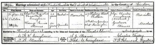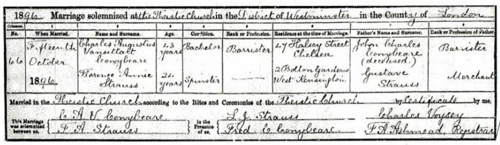 View Original:Marriage certificate of Florence Annie Strauss and Charles Augustus Vansittart Conybeare.PNG (1098x318)