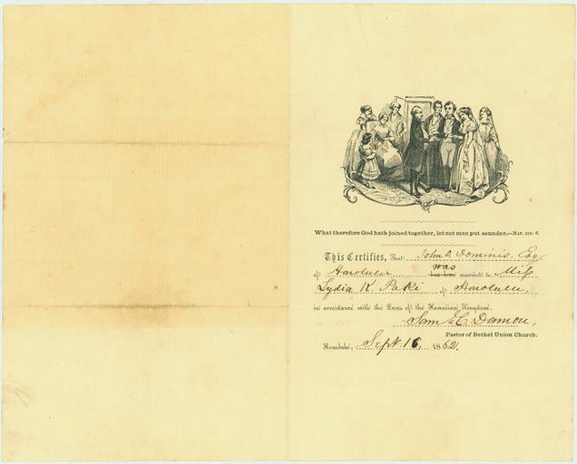 Keywords: Marriage Certificate of John Owen Dominis and Lydia K. Paki.jpg en Marriage Certificate of John Owen Dominis and Lydia K Paki 16 September 1862 http //nutfieldgenealogy blogspot com/2010/12/wedding-wednesday-another-royal-wedding html; Bishop Museum Archives Kingdom of Hawaii 1862-09-16 PD-old-100 John Owen Dominis Liliuokalani Marriage certificates |