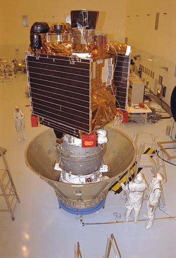 Keywords: mars global surveyor marsglobalsurveyor delta ii deltaii Jet Propulsion Laboratory (JPL) workers in the Payload Hazardous Servicing Facility (PHSF) prepare the Mars Global Surveyor spacecraft for transfer to the launch pad by placing it in a protective canister. The Surveyor spacecraft (upper) is already mated to its solid propellant upper stage booster (lower), which is actually the third stage of the Delta II expendable launch vehicle that propelled the spacecraft on its interplanetary journey to the Red Planet. At Launch Pad 17A on Cape Canaveral Air Station, the spacecraft and booster assembly were stacked atop the Delta vehicle. The Surveyor lifted off on November 7, 1996 and arrived at Mars on September 12, 1997. Image #: 9613634 Date: October 21, 1996 Jet Propulsion Laboratory (JPL) workers in the Payload Hazardous Servicing Facility (PHSF) prepare the Mars Global Surveyor spacecraft for transfer to the launch pad by placing it in a protective canister. The Surveyor spacecraft (upper) is already mated to its solid propellant upper stage booster (lower), which is actually the third stage of the Delta II expendable launch vehicle that propelled the spacecraft on its interplanetary journey to the Red Planet. At Launch Pad 17A on Cape Canaveral Air Station, the spacecraft and booster assembly were stacked atop the Delta vehicle. The Surveyor lifted off on November 7, 1996 and arrived at Mars on September 12, 1997. Image #: 9613634 Date: October 21, 1996 |
