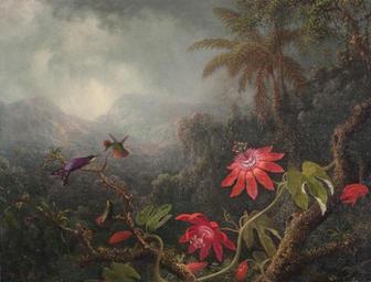 Keywords: Martin Johnson Heade - Passion Flowers with Three Hummingbirds, San Antonio Museum of Art.jpg en Passion Flowers with Three Hummingbirds oil on canvas painting by Martin Johnson Heade circa 1875 San Antonio Museum of Art San Antonio Museum of Art Martin Johnson Heade 1875 Paintings in the San Antonio Museum of Art Heade 1870s paintings by Martin Johnson Heade Exoticism in European culture Passiflora vitifolia Hummingbirds in art Oil paintings of flowers Oil paintings of birds Jungles in art Passifloras in art PD-Art |