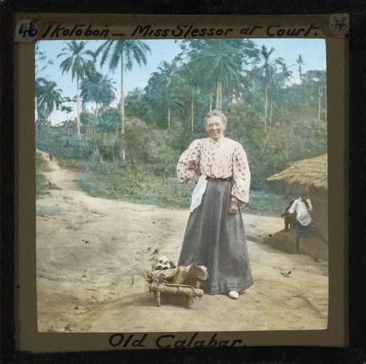 Keywords: Mary Slessor at Ikotobong Court, Calabar, late 19th century (imp-cswc-GB-237-CSWC47-LS2-046).jpg en <br> Mary Slessor at Ikotobong Court Calabar late 19th century Mary Slessor pictured outside Ikotobong court house The thatched roof of the court house can be seen to the right of the picture and Mary Slessor is standing outside There are some items at her feet including a human skull ; In 1889 the British Government established a Protectorate in Calabar and recognising Mary Slessors unique influence she was invited to take up the office of magistrate and superintendent of the district court The people in the area had already become accustomed to referring their disputes to her for settlement Photographer Unknown Subject personal name Slessor Mary Mitchell 1848-1915 Filename imp-cswc-GB-237-CSWC47-LS2-046 tif Coverage date before 1915 Part of collection International Mission Photography Archive ca 1860-ca 1960 Type images Part of subcollection Photographs from the Centre for the Study of World Christianity University of Edinburgh U K ca 1900-ca 1940s Repository name Centre for the Study of World Christianity Archival file impaunpub_Volume7/1320 url Repository address The University of Edinburgh School of Divinity New College Mound Place Edinburgh EH1 2LX United Kingdom Geographic subject country Nigeria Format aacr2 1 lantern slide 8 x 8 cm Geographic subject continent Africa Rights Contact the repository for details Part of series Mary Slessor LS2 Repository email divinity-CSWC ed ac uk Subject lcsh Keyword Justice Administration of; Village communities Date created circa 1880 Publisher of the digital version University of Southern California Libraries Subject aat genre exterior views Format aat lantern slides Legacy record ID impa-m68190 Access conditions http //www ed ac uk/schools-departments/divinity/research/centres/world-christianity/collections-resources File GB 237 CSWC47/LS2/46 1880 author http //digitallibrary usc edu/cdm/ref/collection/p15799coll123/id/64442 PD-old-70-1923 Magic lantern images Images from USC Digital Library uploaded by Fæ International Mission Photography Archive ca 1860-ca 1960 Calabar |