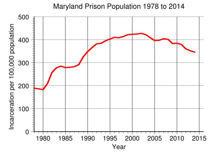 | Keywords: Maryland Prison Population.svg en Maryland prison incarceration rate per 100 000 population from 1978 to 2014 Data from http //www bjs gov/index cfm ty nps BJS 2016-05-11 own Delphi234 other versions current annually Generated with Wikimedia SVG Chart SVG Chart/box cc-zero Demographics of Maryland Imprisonment and detention rates in the United States |