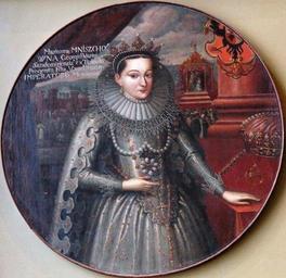 Keywords: Maryna Mniszchówna.JPG Tsarina Marina Mniszech in coronation robes Caryca Maryna Mniszchówna w stroju koronacyjnym Creator Szymon Boguszowicz ca 1606 oil canvas State Historical Museum Moscow Object history < 1613 commission Jerzy Mniszech and Jadwiga Tarło Laszki Murowane century 18 transfer Wiśniowiec Palace Own Martimar PD-Art PD-old-100 Paintings from Laszki Murowane Castle Marina Mniszech in portraits Round portraits of women