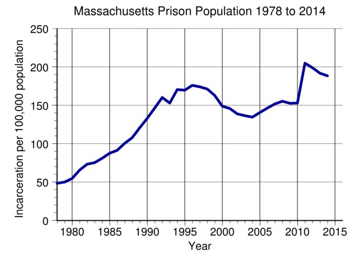 | Keywords: Massachusetts Prison Population.svg en Massachusetts prison incarceration rate per 100 000 population from 1978 to 2014 Data from http //www bjs gov/index cfm ty nps BJS 2016-05-10 own Delphi234 other versions current annually Generated with Wikimedia SVG Chart SVG Chart/box cc-zero Prisons in Massachusetts Imprisonment and detention rates in the United States |