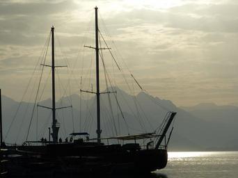 Keywords: mast dew canvas sailing vessel sailing boat ship boot water sea three masted sky twilight cloudy cloudiness ocean mood abendstimmung clouds ansegeln