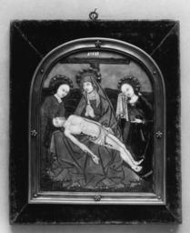 | Keywords: Master of the Large Foreheads - Pietà - Walters 4489.jpg This plaque was probably made for private devotion The Virgin is seated beneath the tau-shaped cross the ends of which are cut aslant Above is the titulus inscribed INRI She wears a dark purple robe a white wimple and a long blue mantle which is drawn over her head Across her lap lies the body of Christ still wearing the crown of thorns and draped with a lioncloth The head of Christ is reverently supported in a green kerchief by a holy woman at the left dressed in a mulberry-colored robe At the right stands Mary Magdalene who wipes her eyes with a cloth and carries a blue pot of ointment She is dressed in a robe of the same color as that of the other holy women nearly hidden by a mantle of gold-brown The three haloes also are painted in the mulberry color Beyond is a green landscape with sketchy indications of grass and trees drawn in dark lines under the green enamel The deep blue sky is dotted with stars early Other date century 16 Renaissance technique painted enamel copper cm 13 4 10 6 accession number 44 89 24461 Henry Walters Baltimore date and mode of acquisition unknown Walters Art Museum Henry Walters Acquired by Henry Walters place of origin Limoges France Walters Art Museum license Limoges painted enamels in the Walters Art Museum Master of the Large Foreheads Media contributed by the Walters Art Museum needs category review Media contributed by the Walters Art Museum needs artist update Painted enamel art in the Walters Art Museum Holy women |