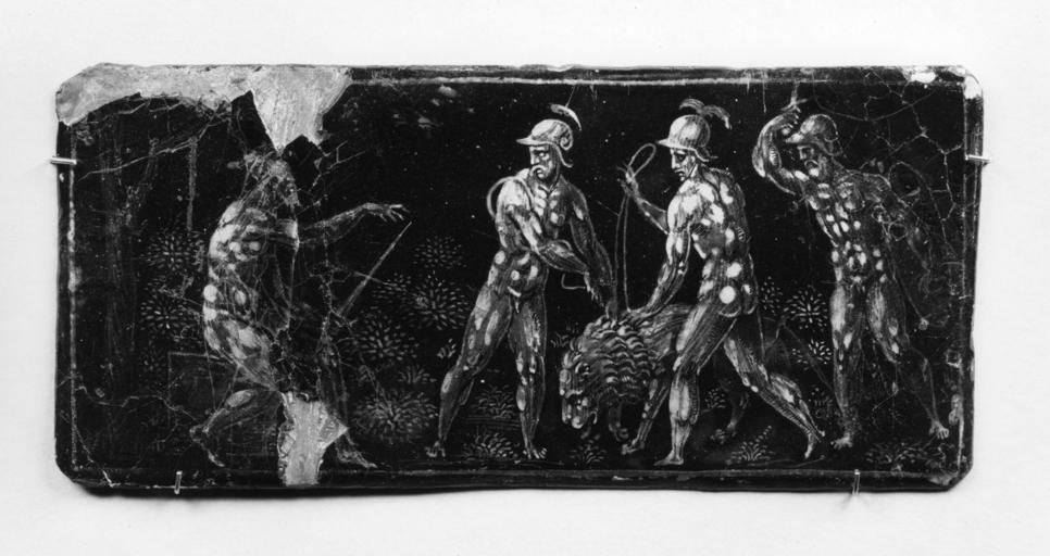 | Keywords: Master of the Mars and Venus Plaque - Sacrifice of a Lion - Walters 4450.jpg Two nude bearded men wearing helmets and followed by a third helmeted warrior bearing a shield lead a lion secured by a double leash before a nude man Mars who sits on a rock to the left and is armed with a sword Shrubs and bushes are scattered in the background The plaque could have been inset in a casket which no longer exists ca 1535 1540 late Renaissance technique painted enamel copper cm 7 2 15 6 accession number 44 50 23114 Thewalt Collection Sale Cologne November 14 1903 lot 993 Jacques Seligmann Paris date of acquisition unknown by purchase Henry Walters city Baltimore Walters Art Museum Henry Walters Acquired by Henry Walters 1906 place of origin Limoges France Walters Art Museum license Limoges painted enamels in the Walters Art Museum Master of the Mars and Venus Plaque Media contributed by the Walters Art Museum needs category review Painted enamel art in the Walters Art Museum Mars god Animal sacrifice in art |