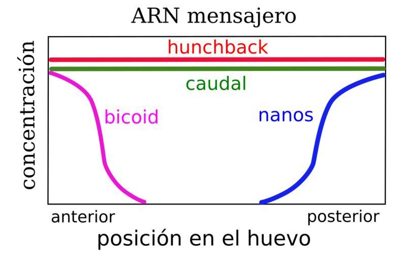 Keywords: Maternal effect mRNAs es.svg Drosophilas bicoid nanos caudal and hunchback mRNAs distribution in egg self-made Image Maternal_effect_mRNAs png-based 2008-02-12 Retama Heredity MRNA