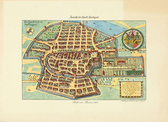 | Keywords: Matthäus Merian, Stuttgart, 1634.jpg de žDie Fürstliche Statt Stuetgart von Matthäus Merian 1634 <br/> A Das Fürstliche Schloß <br/>B Der Fürstliche Stall <br/>C Die Cantzley <br/>D Der Fürstliche Lustgarten <br/>E Das Newe Lusthaus <br/>F Alte Lusthause <br/>G Die Grotten und wasserkünste <br/>H Die Stifftkirch <br/>I Das Rahthause <br/>K Spitalkirch <br/>L Esslinger Vorstatt <br/>M Sankt Leonharts Kirch Hauptstaatsarchiv Stuttgart N 100 Nr 441 Bild 1 http //www landesarchiv-bw de/plink/ f 1-1302855-1 online Creator Matthäus Merian 1634 Historic views of Stuttgart Matthäus Merian ™s Engravings of Stuttgart PD-old-100-1923 |