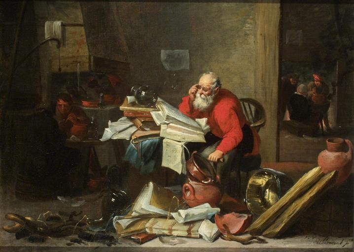 | Keywords: Mattheus van Hellemont The Alchemist.jpg Artwork Creator Mattheus van Helmont The Alchemist by Mattheus von Helmont Antwerp 1623-After 1679 Brussels Oil on Canvas A bearded seated man facing three quarters left with glasses and bright red shirt bends over open book on desk stacked high with mess of books papers glassware More of same at his feet plus broken and unbroken crockery large copper pan and strands of straw throughout At left middle ground two men at table; behind them a man stands by a large furnace and pours from one vessel into another To right in background through partition are three men around a free standing small furnace heating a pot Van Helmont was a follower of Adrien Brouwer and David Teniers II Popular subjects for these artists include peasant interiors alchemists doctors and craftsmen at work century 17 oil canvas in 22 5 16 5 Institution Chemical Heritage Foundation object history exhibition history credit line Gift of Roy Eddleman CHF Collections http //www chemheritage org/ Chemical Heritage Foundation Photograph by Will Brown Originally uploaded from the Chemical Heritage Foundation's http //www flickr com/photos/chemheritage/3193513058/in/set-72157611561392616/ Flickr stream M van Helmont signature lower right Originally uploaded from the Chemical Heritage Foundation's http //www flickr com/photos/chemheritage/3193513058/in/set-72157611561392616/ Flickr stream Rather than uploading a duplicate copy of the same file we've added exhibit information from the Chemical Heritage Foundation's database to the existing image as part of the Wikipedian in Residence initiative at the Chemical Heritage Foundation CHF-cooperation PD-old-100-1923 cc-by-3 0 Chemical Heritage Foundation accession number FA 2000 003 002 Alchemists by Mattheus van Helmont Alchemists from the Netherlands Alchemists from Belgium 17th-century oil paintings of people Chemical Heritage Foundation Images from the Chemical Heritage Foundation Oil paintings of men |