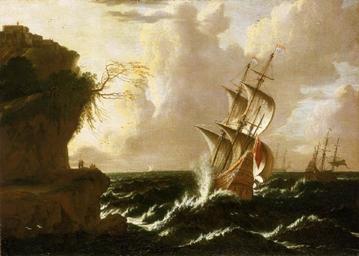 | Keywords: Matthieu van Plattenberg - A Dutch Ship in a Storm.jpg Artwork Creator Matthieu van Plattenberg A storm scene painted soon after the artist moved to Italy In the centre in stern view a Dutch ship with an ornately carved stern and flying the Dutch flag is depicted close-hauled on the port tack She flies the province of Holland's flag from the bow Fortified buildings stand above an outcrop of land top left Below is a rocky overhang with trees carefully positioned for dramatic affect The inclusion of figures adds a sense of drama as they stand or sit under the overhang and watch the ship Several of them have been fishing since their equipment rests nearby but they also serve to highlight the potential plight of the ship running close to the rocks in a stormy sea Spray splashes up the side of the ship in the brisk sea Another ship on the right also with a carved stern has furled its sails Although the artist has applied the typical devices a ship in a storm he has also introduced a flamboyance and colour influenced by his arrival in Italy The painting reflects the golden glow of the Mediterranean in the sky top left with the craggy cliffs jagged moss-laden trees and the bravura of Salvator Rosa 1615-73 Van Plattenberg was a pupil of van Eertvelt whom he followed to Italy He moved from Florence to Paris where he changed his name to Plattemontagne mid-17th century oil canvas cm 68 95 3 Institution National Maritime Museum London object history credit line accession number BHC0795 http //collections rmg co uk/collections/objects/12287 html PD-old-100 Matthieu van Plattenberg Paintings in the National Maritime Museum London 17th-century sailing ships in paintings Sailing ships of the Netherlands |