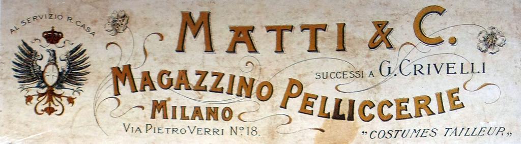 Keywords: Matti & C., magazzino pelliccerie, successi a G. Crivelli, Milano (1).jpg Matti C magazzino pelliccerie successi a G Crivelli Milano Via Pietro Verri No 18 Costumes Tailleur DAL 1847 MATTI VENDE FIDUCIA E NOVITà LA SUA VICENDA CHE INIZIA DUNQUE; ANCOR PRIMA DELLO STORCIO 48 É LUNGA CINQUE; ANZI SEI GENERAZIONI DAL TRISAVOLO ENRICO A GIANLUCA PITTORE E PELLICCIAIO E AI SUOI FIGLI; DALLE LONTRE CHE STAVANO IN PIEDI DA SOLE AI TUBETTI DI VISONE E AL RAT SU E GIÙ IL PESO DELLA TRADIZIONE; LE PELLICCE PER LA SCALA; LA CAROZZA PER PARIGI E QUEL TRENO PER LIPSIA E NANNARELLA DISSE VIA L'INTERFODERA Arpel Fur No 44 Milano Novembre 1989 pagina 100 date Matti C PD-old PD-ineligible <gallery> Matti C magazzino pelliccerie successi a G Crivelli Milano 1 jpg Matti C magazzino pelliccerie successi a G Crivelli Milano 2 jpg Matti C magazzino pelliccerie successi a G Crivelli Milano 3 jpg </gallery> Furriers in Milan Matti C |