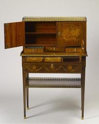 | Keywords: Maurice-Bernard Evalde - Lady's Desk - Walters 6560 - Front View D.jpg This desk bears the stamp of Evalde who became a master ébéniste or maker of inlaid furniture in 1765 He was responsible for the now lost jewel cabinet that King Louis XV of France presented to Marie-Antoinette on the occasion of her marriage to the future Louis XVI in 1770 The key to this desk bears the crown of France indicating that the piece may have been made for a member of the royal family The doors are inlaid in colored marquetry wood inlay Among the images found on the surface are a writing table and navigational instruments The desk's front drawer opens to reveal an inlaid writing surface which slides back to reveal compartments below ca 1770 oak marquetry in naturally colored and stained woods and gilded bronze cm 120 67 ; With drawers open cm 104 14 67 95 65 41 accession number 65 60 9586 La Comtesse Henri du Chastel de la Howarderie Belgium Sale Christies London December 4 1969 lot no 108 Ronald A Lee 1-9 Bruton Place London as agent Walters Art Museum 1969 by purchase Museum purchase in memory of Philip B Perlman 1969 place of origin Paris France Walters Art Museum license Media contributed by the Walters Art Museum needs category review Furniture in the Walters Art Museum Maurice-Bernard Evalde |