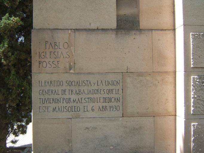 Keywords: Mausoleo Pablo Iglesias 1930 (firmas).JPG en Works by Emiliano Barral 1896-1936 in the Civil cemetery in Madrid Detail in the Socialist leader Pablo Iglesias mausoleum es Obras de Emiliano Barral 1896-1936 en el Cementerio Civil de Madrid Detalle de las firmas de los autores en el Mausoleo del lĂder socialista Pablo Iglesias 2004-01-01 00 04 07 own Latemplanza PD-old-auto 1936 cc-by-sa-3 0 Uploaded with UploadWizard Emiliano Barral Cementerio civil de Madrid Monuments and memorials to Pablo Iglesias |