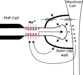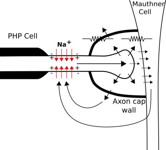 | Keywords: Mauthner Cell axon cap schematic.svg en Describes the structure and function of the mauthner cell axon cap The Red arrows represent the influx of sodium ions through VGNaCs along their electrochemical potential depolarising the PHP cell axon Ions passively leave the axon into the axon cap space to balance the charge influx of the sodium current The potential drop by the resistances of the axon cap and membrane hyperpolarize the M cell Though there is an influx of positive charge into the M cell axon hillock the extracellular face of the membrane becomes even more positive leading to a net hyperpolarization own Staticd 2011-07-19 Neurobiology Fish anatomy Electrophysiology |